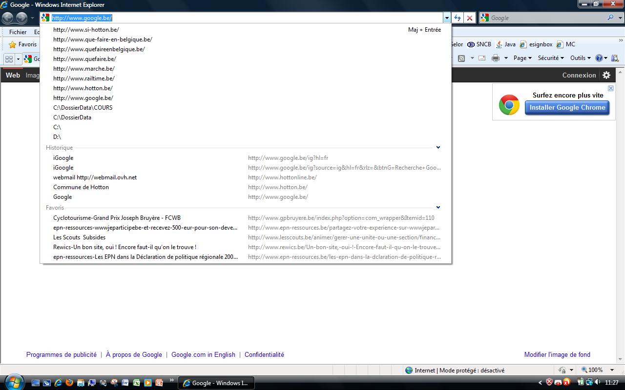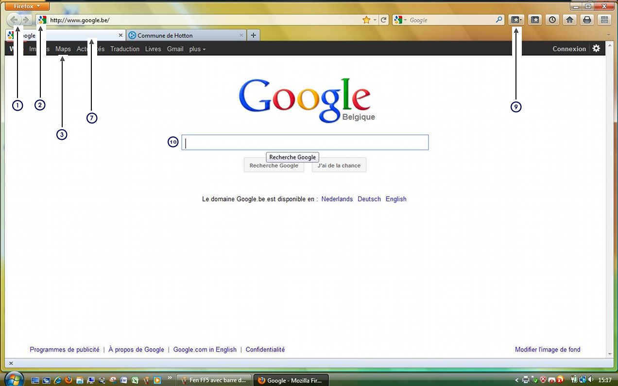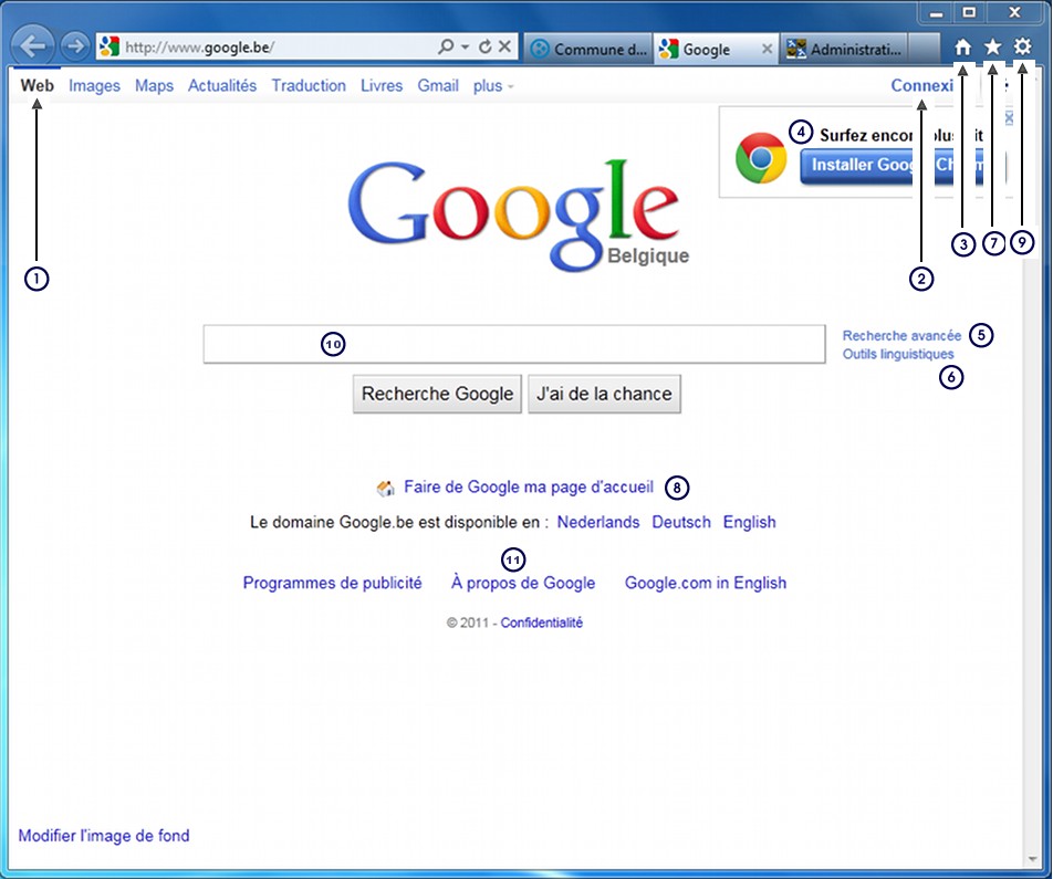 1 : Barre d'adresse dans laquelle vous (avez) tapez l'adresse www.google.be