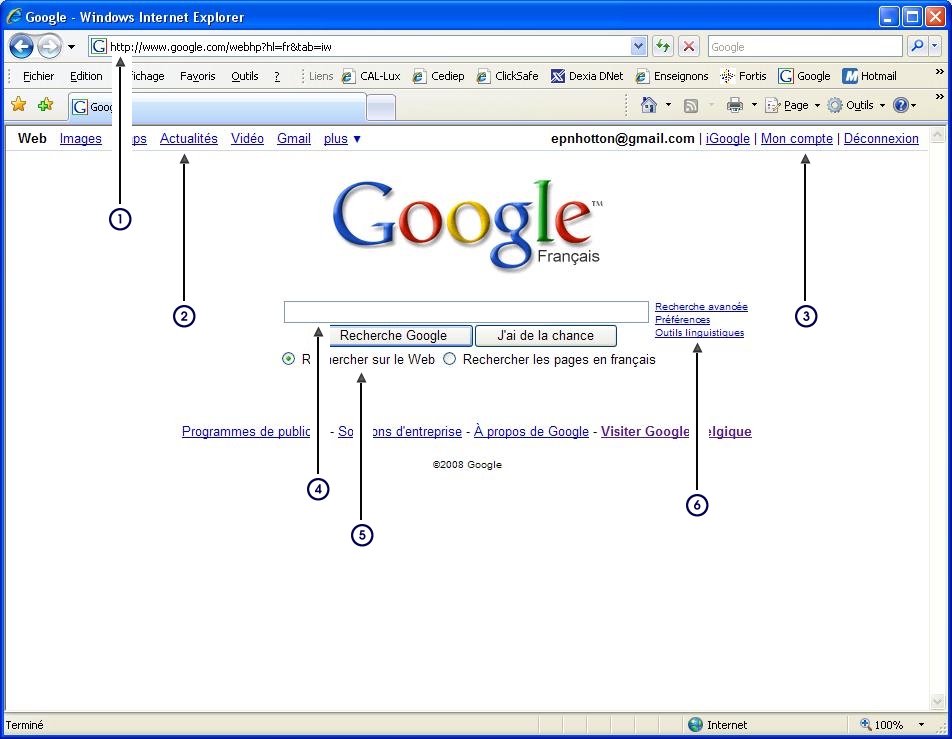 la barre d'adresse (2) pour encoder le site à visiter : ici www.google.be