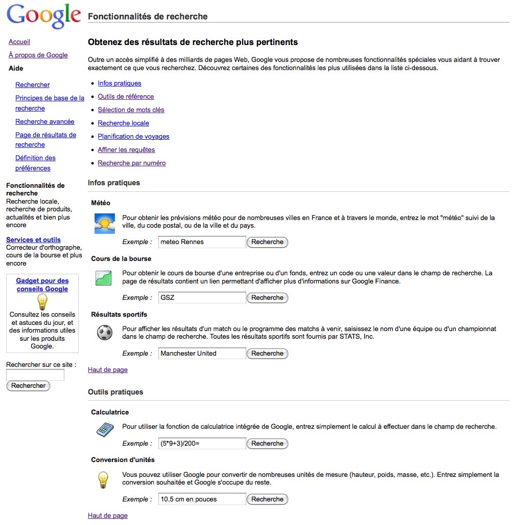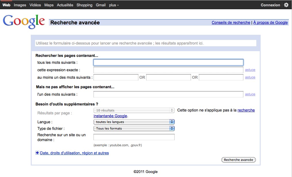 Pour utiliser les opérateurs Google propose la Recherche avancée : cliquer sur Recherche avancée à côté de la barre de Recherche Google (voir Exercices) :