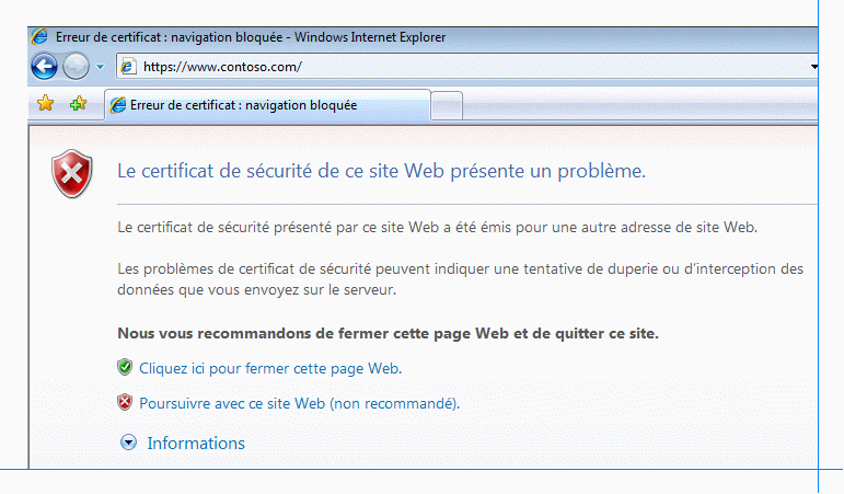 la fenêtre affiche « Le certificat de sécurité de ce site présente un problème » :