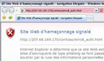 La plupart des navigateurs intègrent ce filtre qui sert à empêcher de faux sites de banques et de fraudeurs à capturer vos renseignements personnels (mot de passe, n° carte de crédit...) et à usurper votre identité. Ce filtre se manifeste comme ceci :