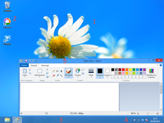 1) Sur l'écran d'accueil (1), faire un clic droit sur le fond de l'écran (bleu foncé ci-dessus)