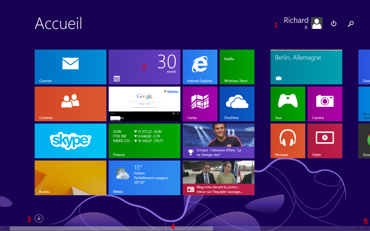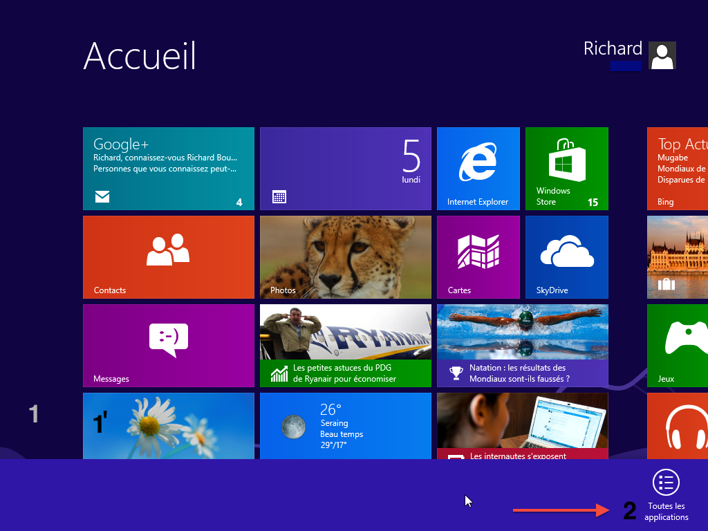 - Sur l'écran Accueil de Windows 8.1, clic G sur la flèche (3) en bas à gauche des tuiles