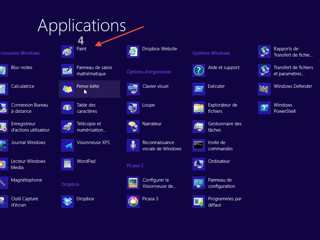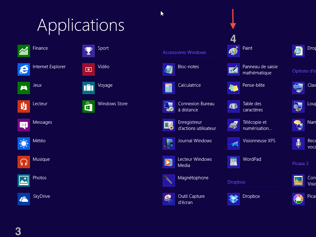 - Dans le groupe Accessoires chercher l'application Paint (4) et cliquer sur Paint
