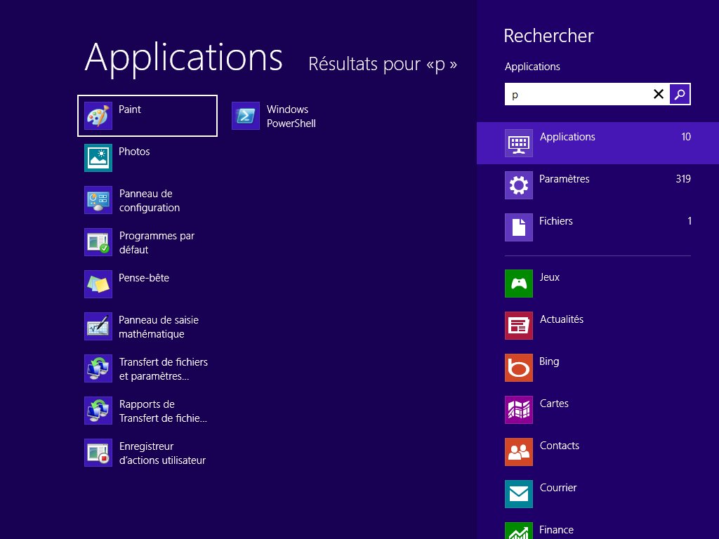 2) Taper P dans la zone Rechercher : cliquer sur Paint