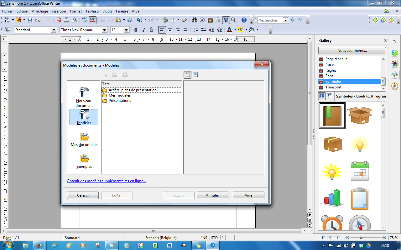 La galerie Openoffice/LibreOffice peut être affichée (plusieurs choix possibles) :