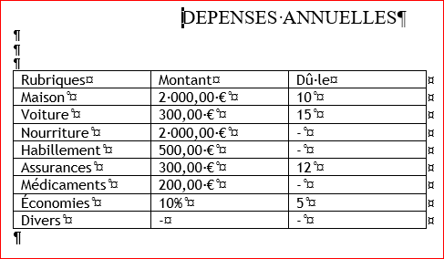 Encoder le titre « Dépenses annuelles » et ajouter 3 lignes vides ;