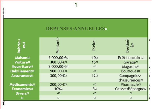 Ajouter une ligne d'entête au début du tableau ; remettre l'orientation horizontal et les bordures ;