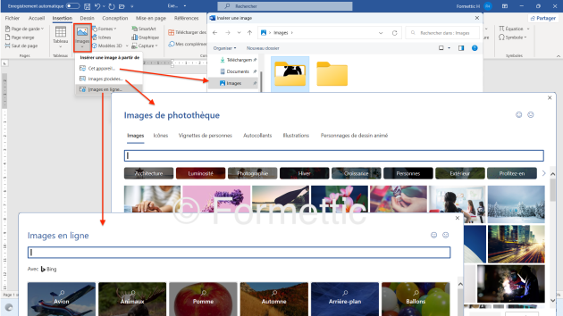 Dans l'onglet Insertion, groupe Illustrations, cliquer sur Images, choisir la source (Cet appareil, Images stockées ou en ligne) :