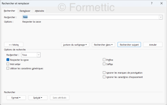 Respecter la casse (les majuscules et minuscules), Mot entier, Utiliser les caractères génériques (* ? ! #... : voir le support Microsoft), Préfixe, Suffixe, Ignorer les marques de ponctuation, Ignorer les caractères d'espacement ;