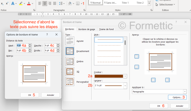 | Bordures | Ajouter une bordure au texte sélectionné ou au paragraphe ; l'option Bordure et trame ouvre une fenêtre avec tous les paramètres ajustables |