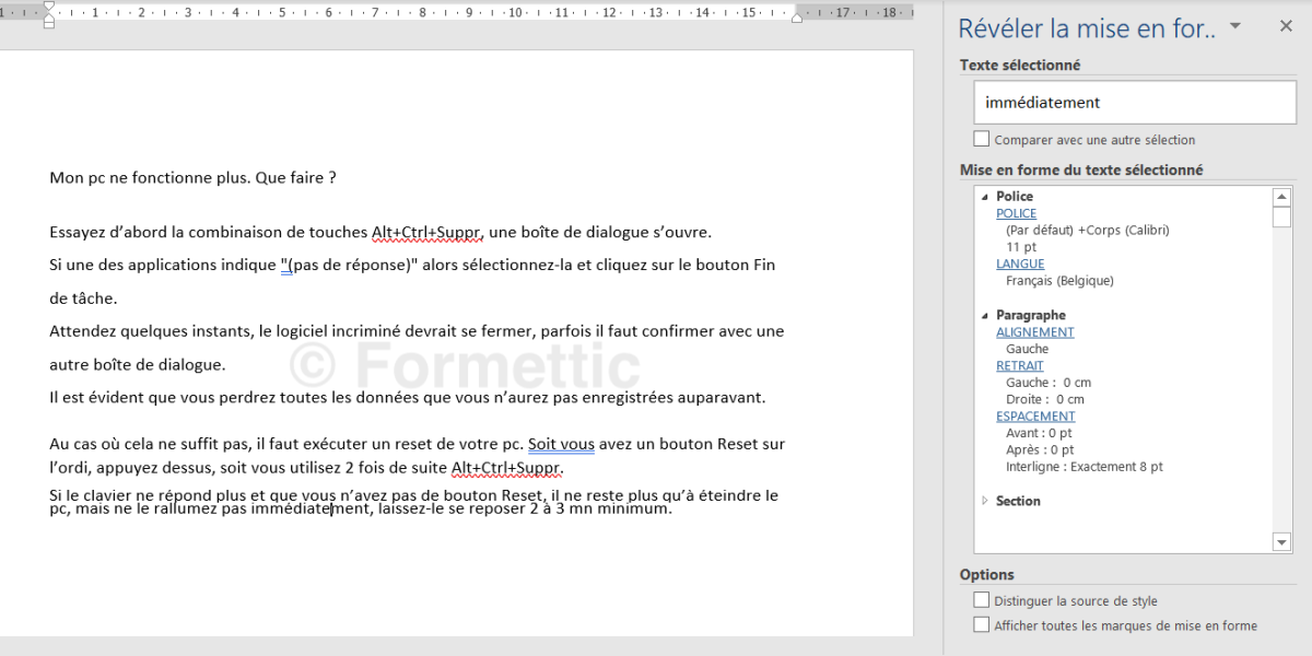 Word permet également de voir la mise en forme d'un texte : sélectionner le texte ou placer le curseur dans le texte et taper MAJ + F1 pour révéler sa mise en forme dans un volet :