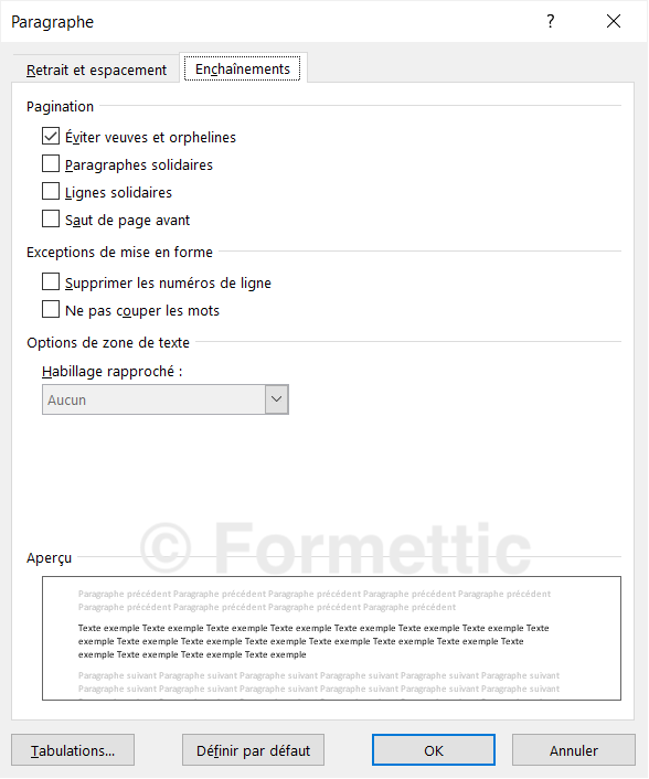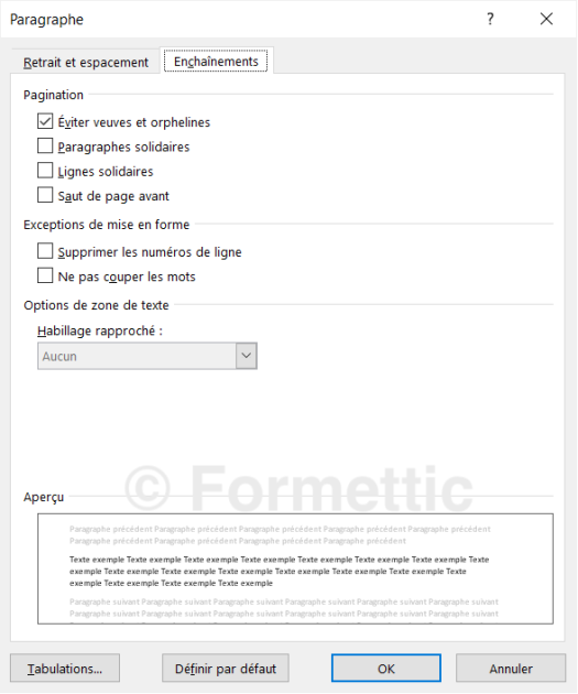 Par défaut, Word interdit que la dernière ligne d'un paragraphe n'apparaisse en haut d'une page (ligne veuve) et que la 1re ligne d'un paragraphe n'apparaisse en bas d'une page (ligne orpheline). Cette fonction est placée dans la fenêtre Paragraphe, dans l'onglet Enchaînements : l'option Éviter veuves et orphelines est cochée, par défaut :