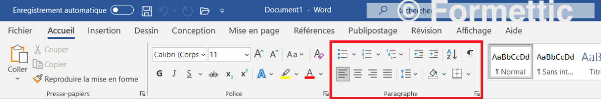 ou cliquer sur une commande de la fenêtre Paragraphe (après activation, via le lanceur de ce groupe), dans l'onglet Retrait et espacement :