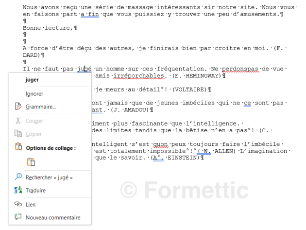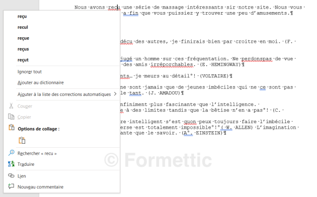 Pour les corriger il suffit de cliquer droit sur le mot souligné et de sélectionner la bonne suggestion dans le menu contextuel : exemple de faute d'orthographe :