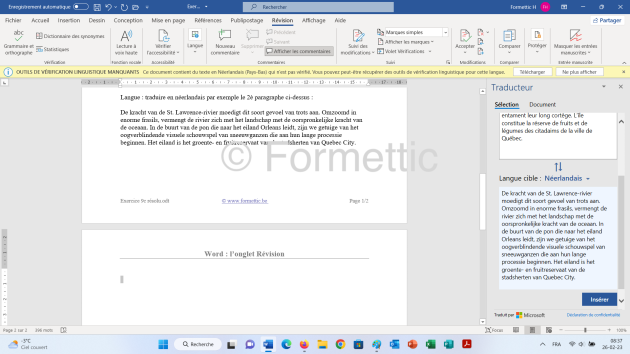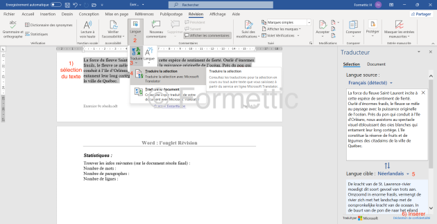 Traduire un texte : sélectionner une phrase ou un paragraphe et cliquer sur Langue / Flèche sous Traduire / Traduire la sélection. Le volet droit ouvre le Traducteur et vous demande la langue cible : choisir Néerlandais puis Insérer : exemple :