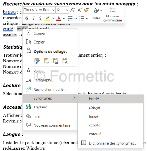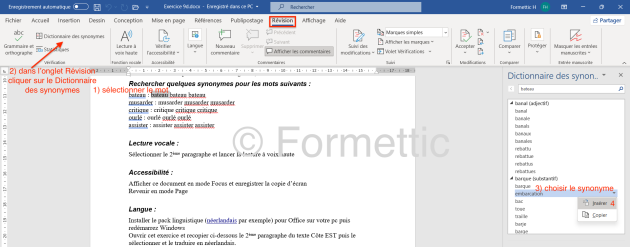 Synonymes via le Dictionnaire des synonymes (onglet Révision, groupe Vérification) ;