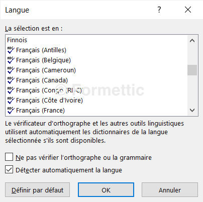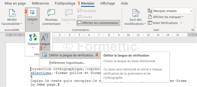 Sélectionner tout le texte du document (CTRL + A) puis, dans l'onglet Révision, cliquer sur Langue dans le ruban puis à nouveau sur le sous-menu Langue puis sur Définir la langue de vérification :