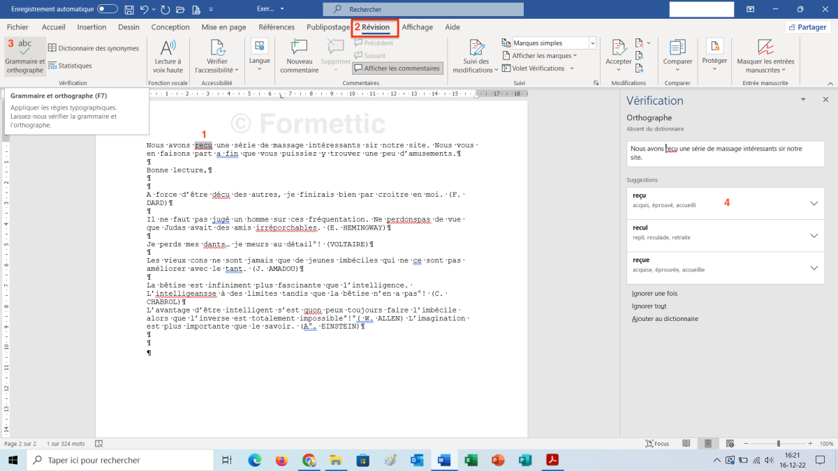 Dans le volet Révision, cliquez sur Grammaire et orthographe : un volet s'ouvre à droite ; choisissez dedans la bonne suggestion :