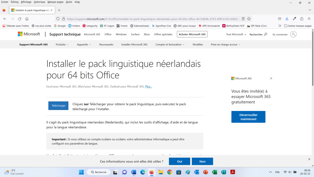 Installer sur votre pc le pack linguistique néerlandais pour Office (vous devrez redémarrer Windows) :