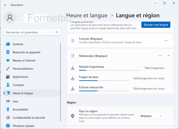 Aller dans les Paramètres de Windows / Heure et langue / Langue et région / Ajouter une langue / Néerlandais (attendre la fin des téléchargements) :