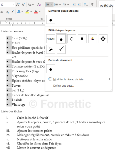 Cliquer sur un des éléments de la liste de courses et modifier la puce en gros point.