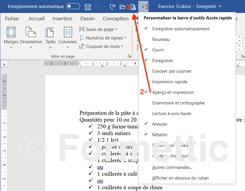 (NB : pour mettre cette commande dans la barre d'accès rapide, cliquer sur la petite flèche à droite de cette barre et cocher cette commande)