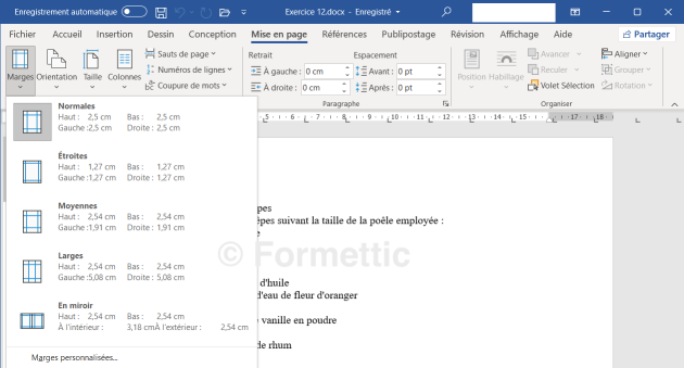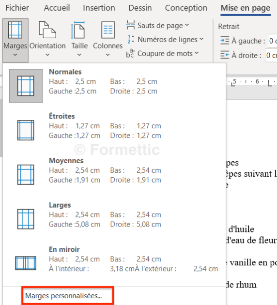 (NB : Marges personnalisées vous renvoie à la fenêtre Mise en page, voir ci-dessus)