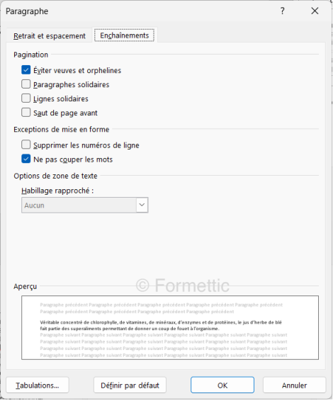 Dans la boîte de dialogue Paragraphe, sélectionnez l’onglet Enchaînements.