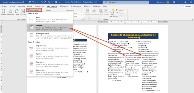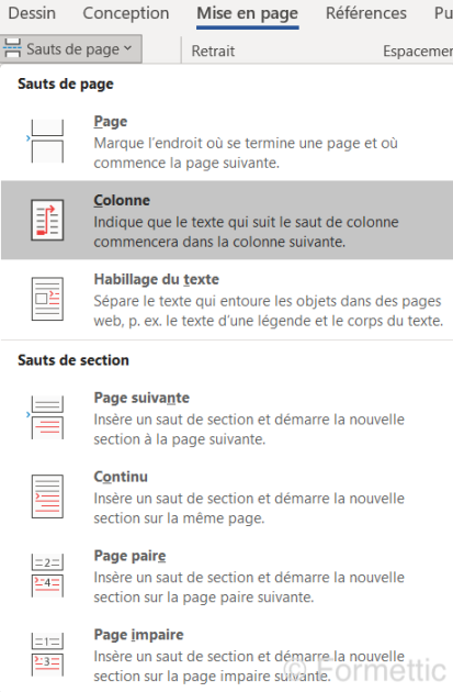 Des sauts de colonnes sont possibles via l'onglet Mise en page et le bouton Saut de page puis choisir Colonne :