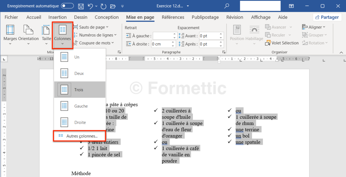 Le bouton Colonnes permet d'afficher le texte sélectionné en colonnes : exemple :