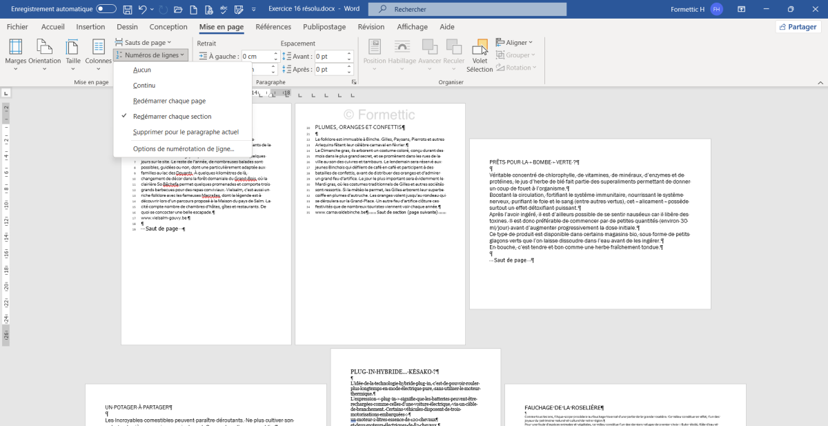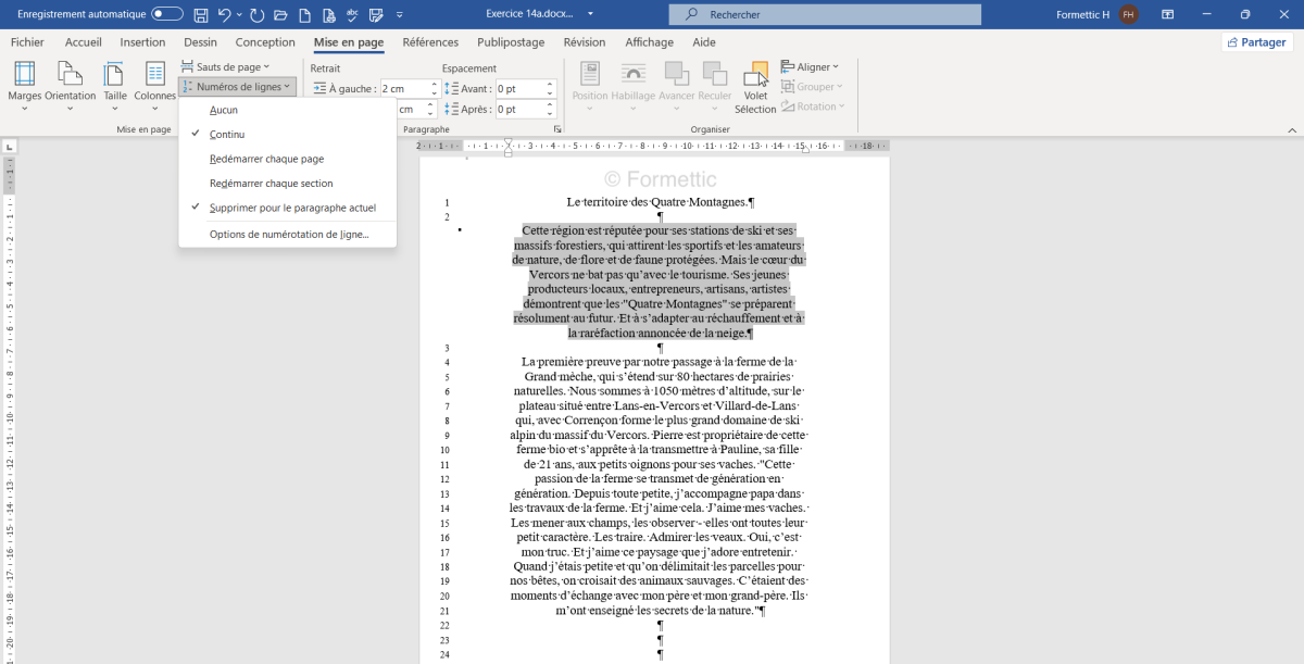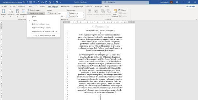 Exemples : Reprendre l'exercice 14a.docx [doc] : afficher les numéros de page avec le bouton Numéros de lignes dans l'onglet Mise en page :