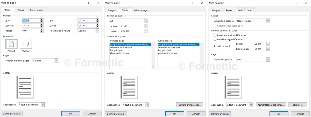 NB : les marges peuvent être différentes si une section a été définie dans une même page ou entre 2 pages.