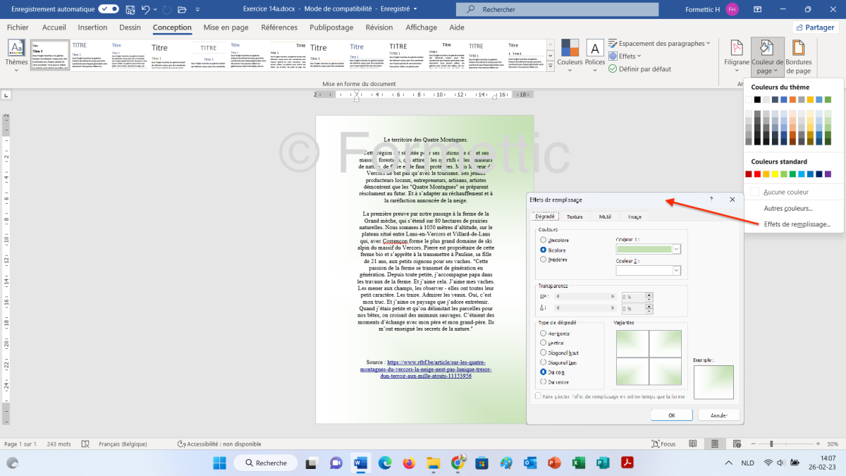 Couleur de page : cliquer sur Couleur de page et choisir une couleur d'arrière-plan, éventuellement un effet de remplissage (dégradé, texture, motif ou image) :