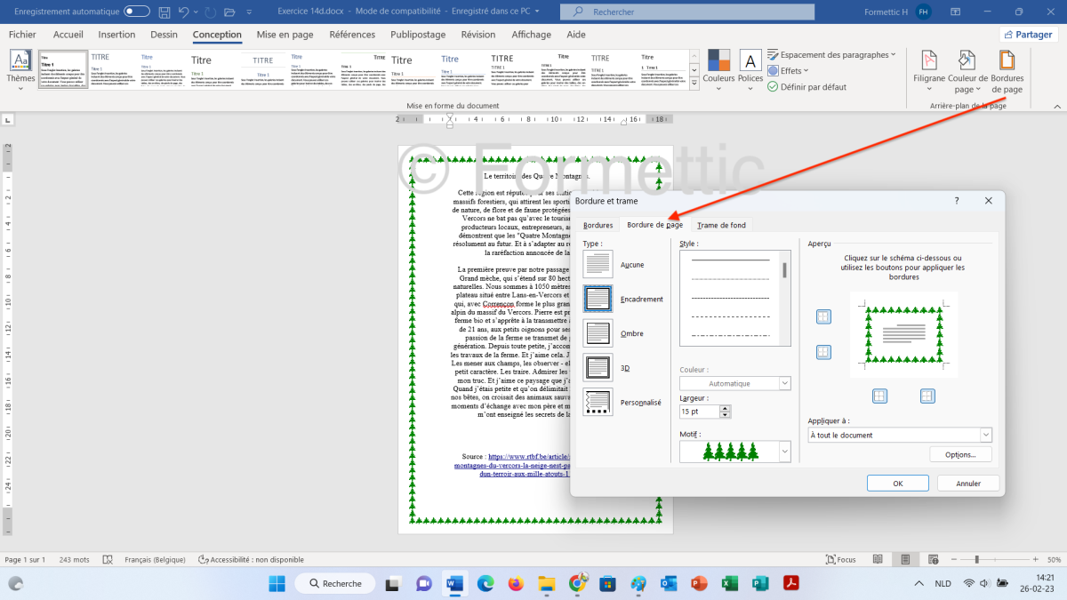 Bordures de page : cliquer sur Bordures de page et choisir un type, un motif et une largeur :