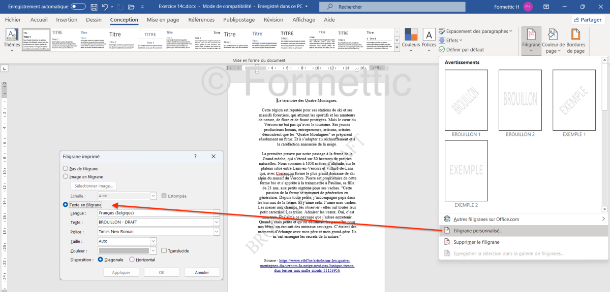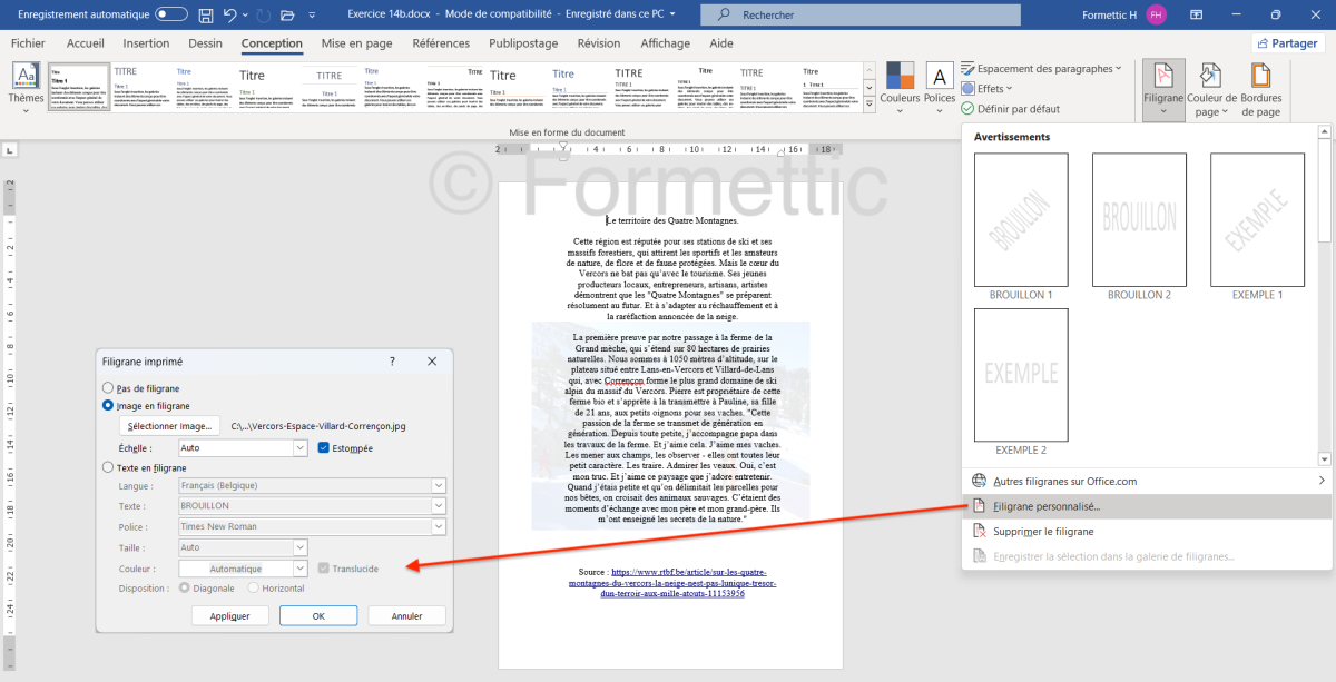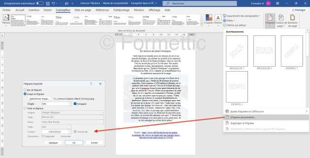 Filigrane (texte ou image en arrière-plan voilé) : cliquer sur Filigrane puis choisir une option : Avertissements ou Filigrane personnalisé : soit Image en filigrane : choisir l'image et l'échelle, estompée ou non :