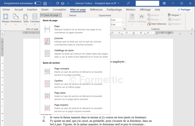 Dans l'onglet Mise en page, cliquez sur Sauts de page puis choisir le type de saut voulu : Page suivante, Continu...