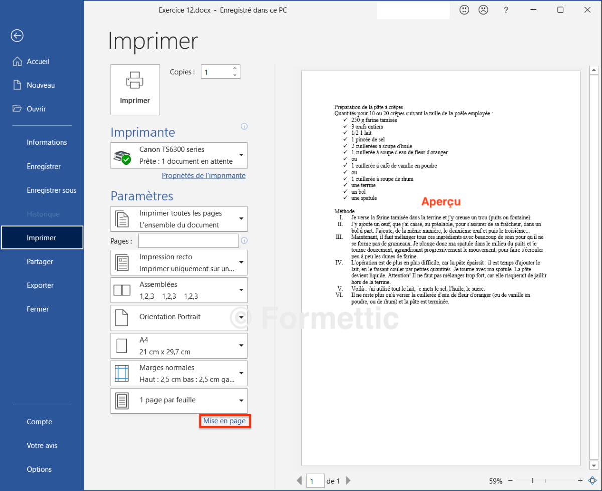 Dans le menu Fichier / Imprimer le lien Mise en page (en bas des paramètres)