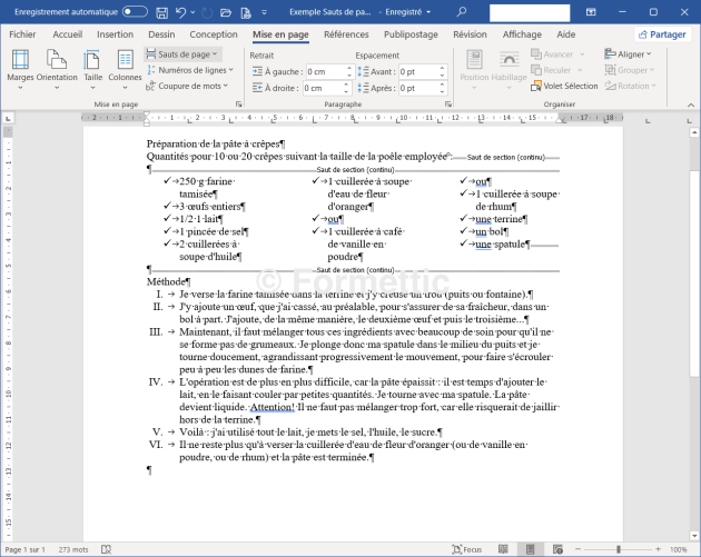 Ouvrir l'exercice 12 et insérez un saut de page Continu après la 2è phrase (après "poêle employée") :