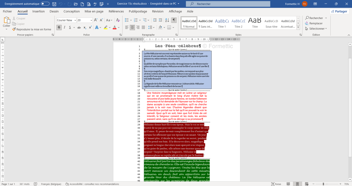 Section 4 : police Lucida Handwriting 11, alignement justifié, surbrillance vert ; couleur de texte vert accentuation 6, plus clair 80% ;
