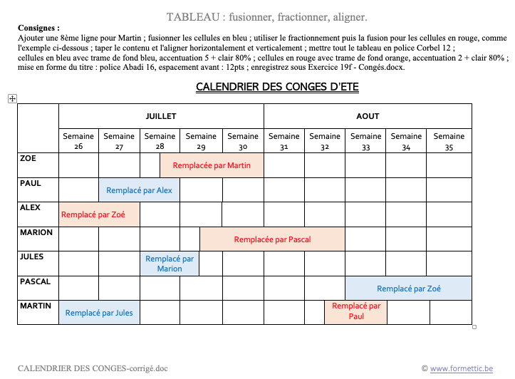 Ajouter une 8ème ligne pour Martin ; fusionner les cellules en bleu ;