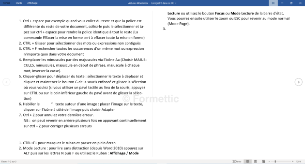 Ctrl + Espace : quand vous collez du texte depuis internet ou depuis un autre document et que la police est différente du reste de votre document, collez-le puis sélectionnez-le et tapez sur CTRL + Espace pour rendre la police identique à tout le reste (NB : La commande Effacer la mise en forme sert à effacer toute la mise en forme)
